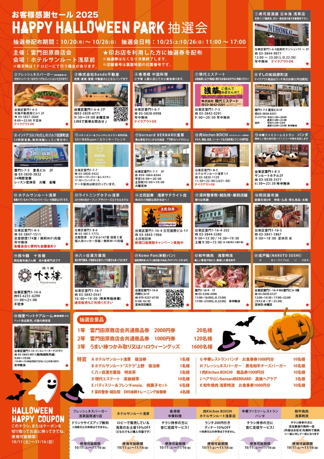 雷門田原商店会共通商品券・商店会店舗食事券など豪華な景品が当たります。ハズレ無し!白い球が出ても毎年恒例「うまい棒つかみ取り又はハロウイーングッズ」がもらえます。- ※抽選券はチラシの★印がついた店舗でGET!